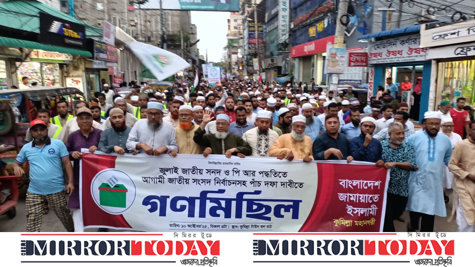 জুলাই জাতীয় সনদ ও পিআর পদ্ধতিতে আগামী জাতীয় সংসদ নির্বাচন সহ পাঁচ দফা দাবীতে কুমিল্লা মহানগরী জামায়াতে ইসলামীর উদ্যোগে আজ ১০ অক্টোবর শুক্রবার বিকালে কুমিল্লা টাউন হল মাঠে সংক্ষিপ্ত সমাবেশ ও পরে নগরীতে বিশাল গণমিছিল বের করে।