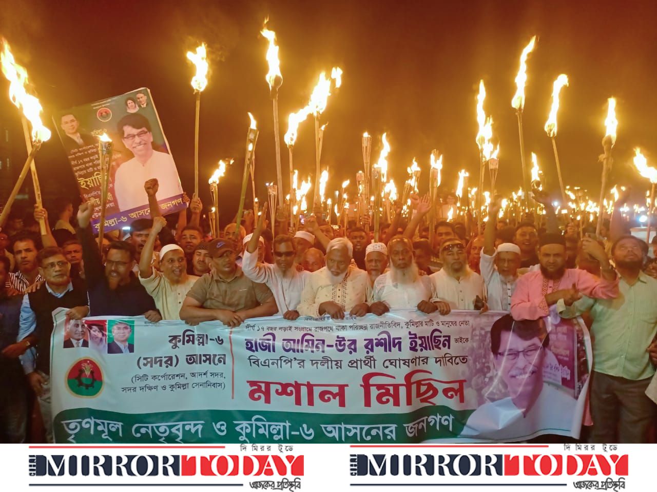 কুমিল্লা–০৬ (সদর, সদর দক্ষিণ, সিটি কর্পোরেশন ও সেনানিবাস) আসনে বিএনপির চেয়ারপারসনের উপদেষ্টা হাজী আমিন উর রশিদ ইয়াছিনকে দলীয় মনোনয়ন দেওয়ার দাবিতে টানা নয়দিন ধরে ধারাবাহিক কর্মসূচি পালন করছেন স্থানীয় নেতাকর্মীরা। এই আন্দোলনের অংশ হিসেবে মঙ্গলবার (১১ নভেম্বর) সন্ধ্যায় নগরীতে বিশাল মশাল মিছিল অনুষ্ঠিত হয়। এতে কয়েক হাজার নেতাকর্মী অংশ নেন বলে আয়োজকরা দাবি করেন।